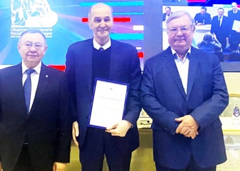 Ирек Файзуллин и Сергей Степашин в ходе торжественной церемонии награждения вручили Анвару Шамузафарову благодарность ОС Минстроя за активное участие в благотворительной акции на территории Дивеевской школы-интерната.