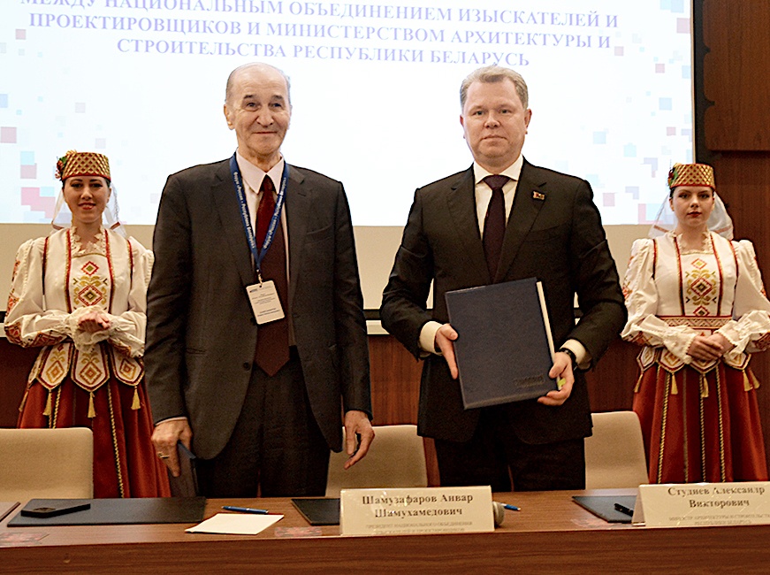 В минувший вторник, 17 июня в рамках работы Международного архитектурно-строительного форума «Россия – Республика Беларусь» в Минске президент Национального объединения изыскателей и проектировщиков Анвар Шамузафаров и министр архитектуры и строительства Республики Беларусь Александр Студнев подписали Соглашение о сотрудничестве. Об этом сообщили наши коллеги из пресс-службы НОПРИЗ.